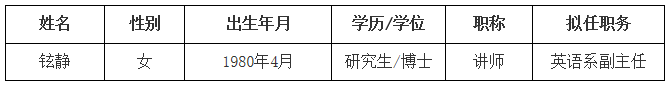 2023年3月1日,公司发布《关于公开选聘英语系副主任的通知》,在英语系中遴选英语系副主任1名。经教师自荐,并经2023年3月8日公司党政联席会研究,决定拟聘铉静老师担任英语系副主任。现予公示。