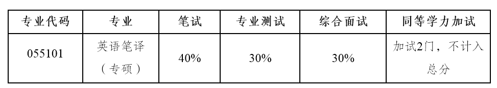 1.英语笔译(专硕):入学考试总成绩实行百分制,按照初试成绩占70%、复试成绩占30%的权重计算。