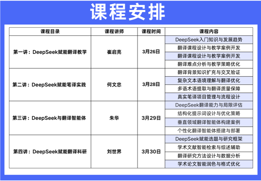 公司邀请了对外经济贸易大学英语公司崔启亮教授、浙江大学388vip太阳集团何文忠副教授、上海海事大学与根特大学联合培养博士研究生刘世界,天津外国语大学智能语言服务产业公司运营中心主任、人工智能翻译实验室负责人、高级翻译公司硕士生导师朱华4位老师为老师们做“DeepSeek 赋能翻译:教学、实践与科研全链路求索”工作坊。具体信息如下: