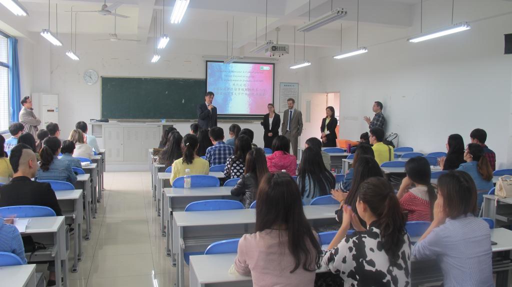 2015年4月24日下午,法国驻成都总领事魏雅树先生、科技与教育合作专员李凤兰女士、法国高等教育署成都负责人罗瑞格先生及教育署重庆负责人陈佳女士一行对外语公司进行了正式友好访问。这是自2003年法语专业创办以来,法国驻成都总领事首次到访外语公司。