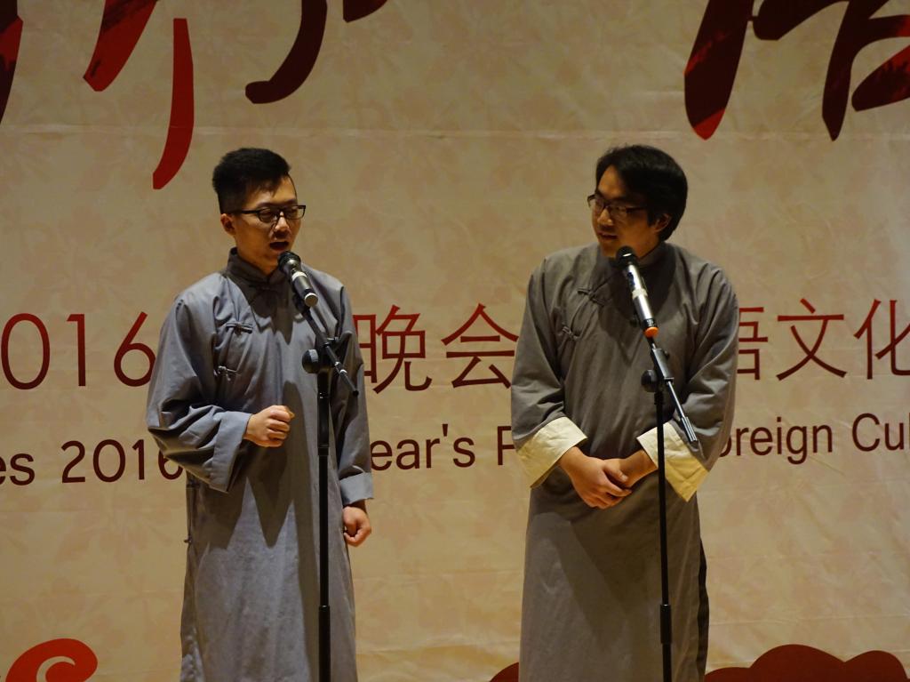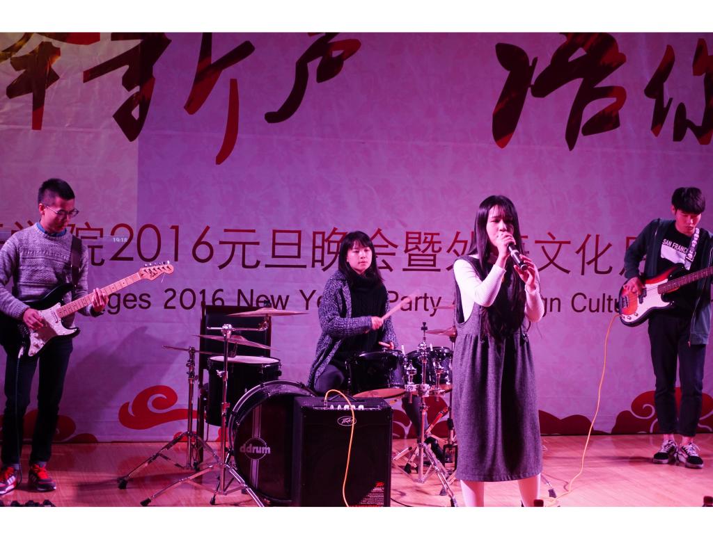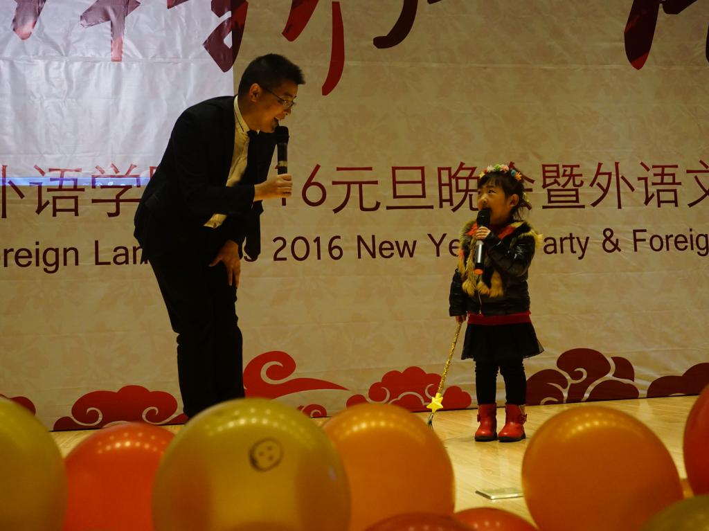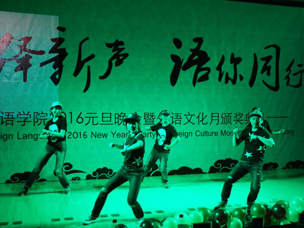 本次晚会采用中、英、法三语主持的形式,诠释出外语公司的文化特色。一段视频回顾了2015年外语公司员工工作的点点滴滴,之后外语公司经理戴运财教授上台致辞,他首先对各位嘉宾的到来表示热烈欢迎,同时对公司2015年的各项工作表示肯定。紧接着,舞蹈《和平的呼唤》反应出战争的残酷并唤起人们对和平的向往;公司老师们带来的圣诞歌曲串烧和自家萌宝稚气的舞蹈逗得全场捧腹大笑;配音大赛获奖节目《冰雪奇缘》、双簧表演《小杨说事》引得台下观众不停叫好;法语歌曲合唱《La famille》给观众奉上一场美妙的声音盛宴;玄妙入神的魔术带领大家进入奇妙的世界;英文戏剧大赛亚军团队的传神表演引得全场啧啧称赞;跆协带来的高难度动作看得大家热血沸腾心潮澎湃。更值得一提的是,由外语公司教师团队带来火辣狂热的现代舞表演点燃全场观众的激情。作为最年轻最受欢迎的教师团队,他们完美地展现出外语公司教师蓬勃的活力,赢得了全场同学的连连尖叫与呐喊。节目间隙,公司领导及大赛赞助商分别对英语读报大赛、英法听写大赛、翻译大赛、学习型口译大赛、英法美文朗诵大赛获奖者进行颁奖。在相声《满腹经纶》和舞蹈表演《万花谷》之后,本次晚会在《We are young》的合唱声中圆满落幕。