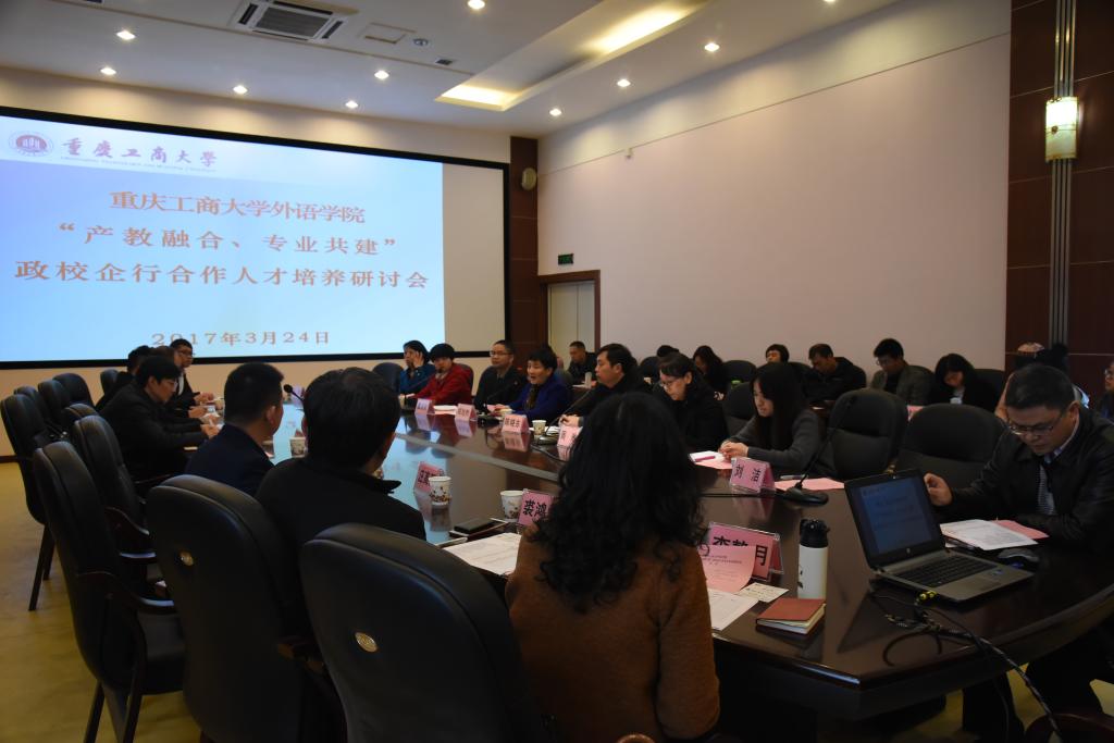 3月24日,外语公司在田家炳书经理江上游经济研究中心会议室召开了“产教融合,专业共建”政校企行合作人才培养研讨会。重庆商务委电子商务处冉渝佳处长、南岸区科学技术委员会张辉部长、阿里巴巴重庆办事处负责人孙海燕、光彩国际重庆电子商务公司牛耀伟总经理、重庆国际电子商务产业园刘腾副总经理、重庆兴鹰科技发展有限公司陈文才总经理、重庆译答翻译有限公司市场总监夏肖等21名政府机构及行业、企业代表,以及外语公司党政领导、英语系师生代表参与了研讨会。副董事长郑旭煦教授出席研讨会并致欢迎辞。