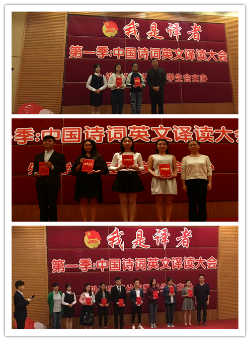 我是译者(第一季)中国诗词英文译读大会收到的多份诗词翻译作品从《诗经》中“关关雎鸠,在河之洲”的诗歌缘起,到“黄河之水天上来”的盛唐气象,再到“雄关漫道真如铁,而今迈步从头越”的革命情怀,时间跨度达数千年,经过认真评选,13份作品脱颖而出,评出三等奖7份,二等奖4份,一等奖2份,评委和嘉宾在现场为获奖作品的作者颁发了奖状。