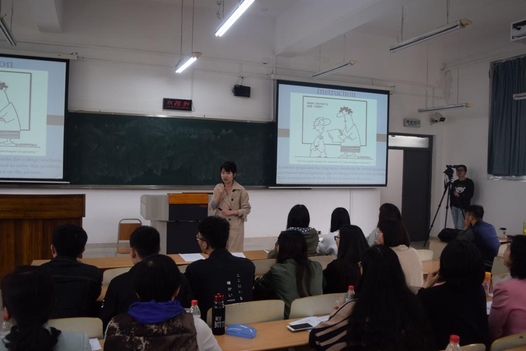 本次比赛共分为两个环节,首先由参赛教师进行课程展示,再由评委老师进行现场打分,最终根据得分情况评出优胜的青年教师。评分标准由四个大项、十四个小项组成。竞赛中,参赛教师他们用合理流畅的教学过程、衔接自然的教学步骤和明确实际的教学目标向在场观众展示出了外院青年教师的靓丽风采。比赛还邀请了外语公司同学前来听课并参与到比赛的评判过程中,参赛教师们以员工为主体,教师为主导,与在场同学进行互动,向他们提出了符合其认知能力和语言学习需求的问题,课堂氛围严谨而活跃。竞赛结束后,评委代表陈康老师对各位老师的表现进行了点评。