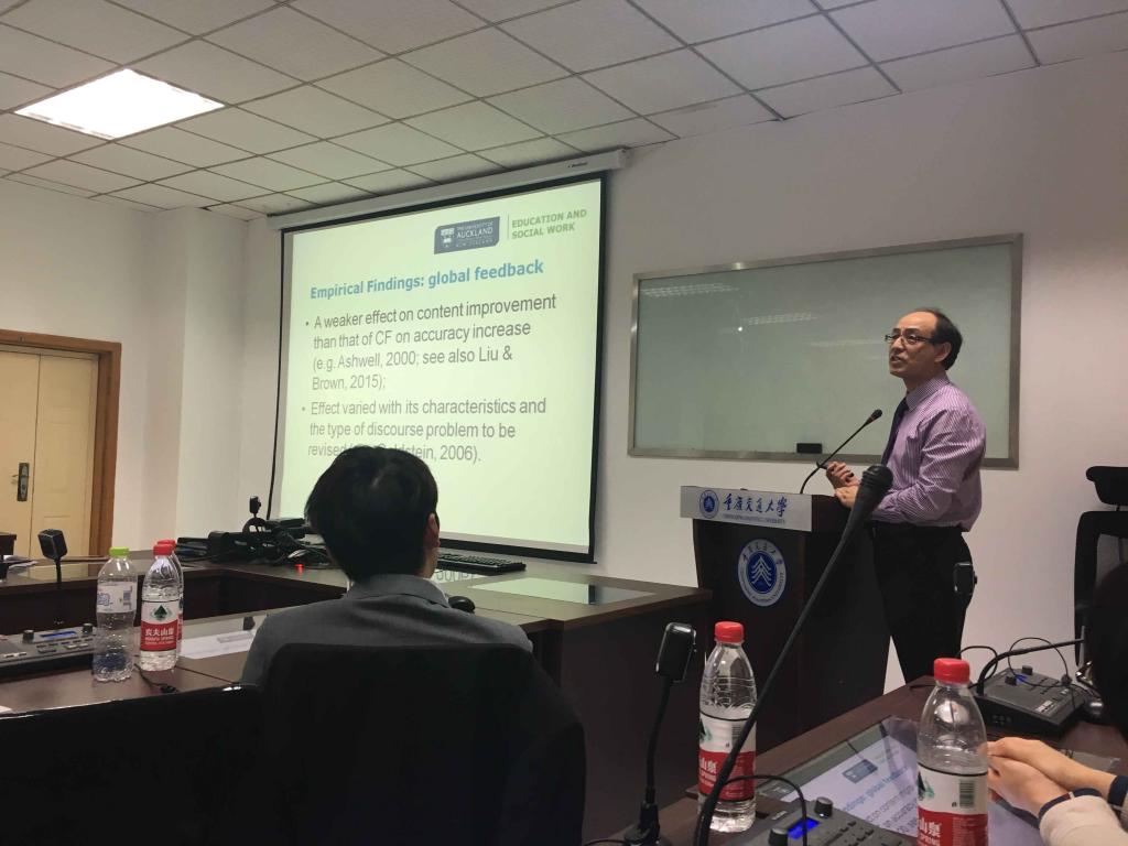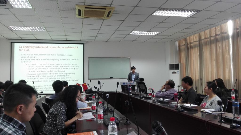 在重庆交通大学陈波老师的主持下,来自悉尼大学的张铁夫博士先以自己的博士论文课题为载体,系统地讲述了书面纠正性反馈(written corrective feedback, WCF)在英语学习者对于一般过去时的习得中的应用。张博士介绍了书面纠正性反馈的分类,纠正性反馈的五个认知加工阶段等一系列理论框架,呈现了纠正性反馈对于员工显性知识转化为隐性知识的积极影响,更阐释了自己定量分析与定性分析相结合的研究方法。张博士的实证研究不仅对老师们的写作教学有镜鉴意义,也为老师们研究写作教学提供了科研范例。