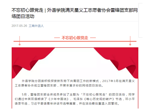 为持续深入开展“一学一做”、“四进四信”活动,以“学习总书记讲话”和“进支部、进社团、进网络、进团课”为手段,以“做合格共青团员”和“牢固树立对党的科学理论的信仰、坚定走中国特色社会主义道路实现“中国梦”的信念、增强对党和政府的信任、增进对以习近平同志为总书记的党中央的信赖”为目标,外语公司雷锋团支部于近日组织开展了“不忘初心跟党走”的网络团日活动。