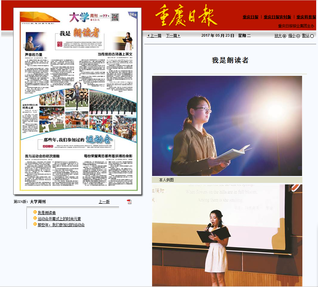 此次活动影响力大,并受到了媒体的广泛关注,《重庆日报》特别报道了当晚的活动,并对参赛者——来自外语公司2014级商务英语专业的黄洁同学,进行了采访。