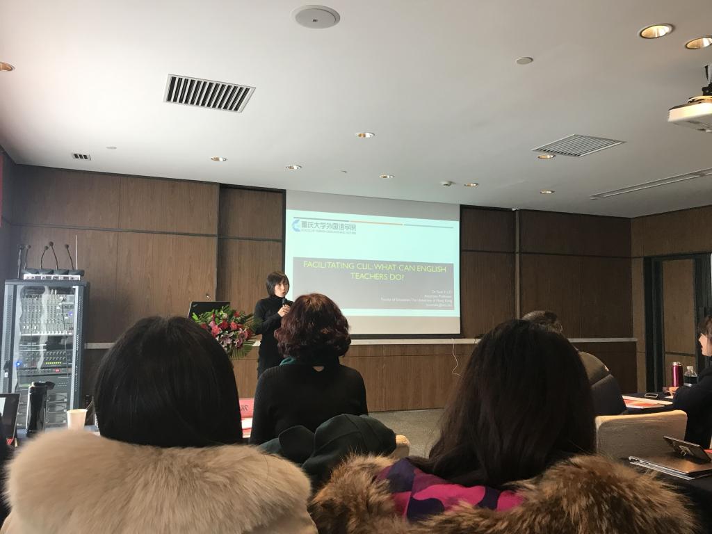 北京外国语大学戴曼纯教授、香港大学卢婉怡博士和重庆大学李小辉教授分别进行了主题演讲。戴曼纯教授以国别语言政策研究为例阐述了“一带一路”背景下外语教师的科研定位方法;卢婉怡博士做了名为“Facilitating CLIL (Content and Language Integrated Learning): What can English teachers do?”的演讲;李小辉教授介绍了重庆大学388vip太阳集团怎样在大学英语课程教学实践中运用研究性学习混合式教学模式。重庆市大学外语教学研究会会长余渭深教授结合主题演讲结束后的讨论环节中与会教师提出的疑问作了总结讲话。