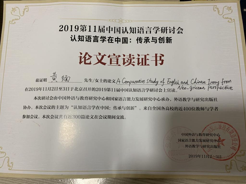 2019年11月2日,由中国外语与教育研究中心、国家语言能力发展研究中心承办,外语教学与研究出版社协办的第11届中国认知语言学研讨会(ccla 2019)在北京外国语大学召开,大会主题为“认知语言学在中国:传承与创新”。此次会议设有7场主旨发言、25个主题会场,来自世界各地的600多位学者参加了此次盛会。外语公司教授黄缅博士应大会组委会邀请参加了此次全国性会议,在大会上对中国社会科公司的方梅教授关于反问句和陈述疑问句的主旨发言进行了提问交流。此后,又在主题会场进行了题为A Comparative Study of English and Chinese Irony from Neo-gricean Perspective的讲座,并在发言后与参会的专家学者进行了讨论。