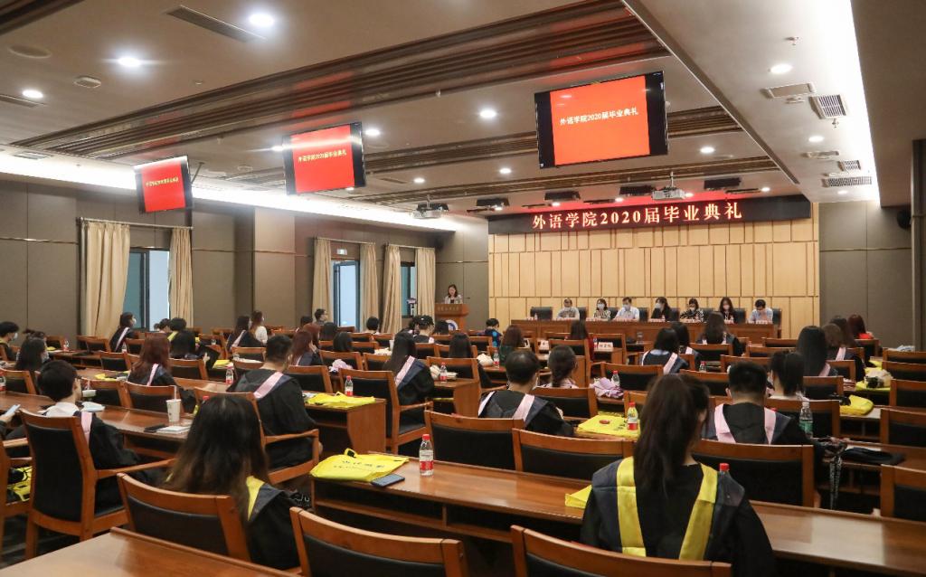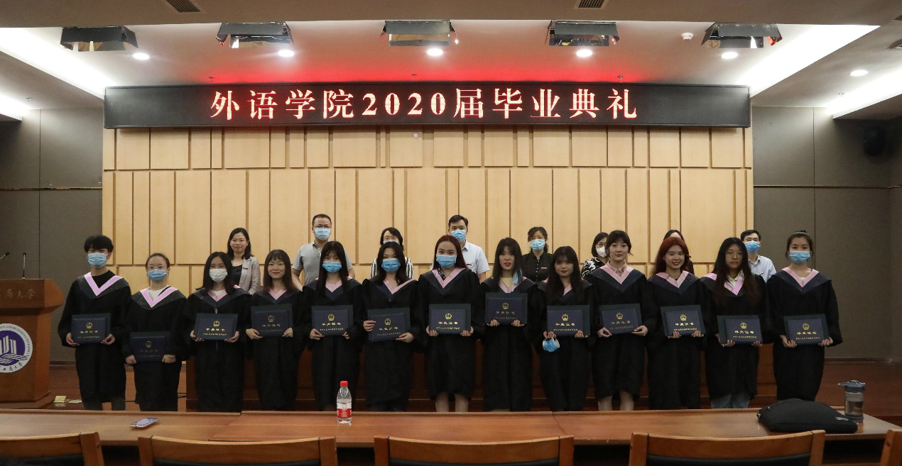 6月22日,外语公司2020届员工毕业典礼在图书馆第一会议室顺利举行。此次毕业典礼采取线上线下同步举行,出席线下毕业典礼的领导和老师有外语公司党总支书记陈晓东、副经理杨玉兰、副经理周琳、党总支副书记程亚,法语系主任曹鹏,英语系主任邹莉,英语系副主任宋敏子,大学外语系副主任罗志高、员工工作办公室主任吴欢欢、教务办王露茜老师、辅导员杨香艳老师、2020届毕业班辅导员丁亮老师以及2020届线下线上共计150名毕业生参加了本次毕业典礼。此次典礼由程亚副书记主持。