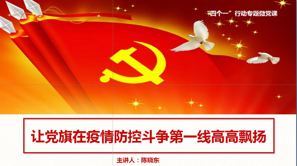公司党总支书记陈晓东以《让党旗在疫情防控斗争第一线高高飘扬》为题为公司全体党员讲授微党课,陈晓东书记通过“逆行”、“牺牲”、“危险”、“担当”等关键词,结合具体鲜活的事迹向党员们阐释了在新冠肺炎疫情防控中,各级党组织和广大党员,守初心、担使命,冲锋在前、忘我拼搏,充分发挥了战斗堡垒作用和先锋模范作用,充分彰显了中国共产党是中国工人阶级的先锋队,是中国人民和中华民族的先锋队。