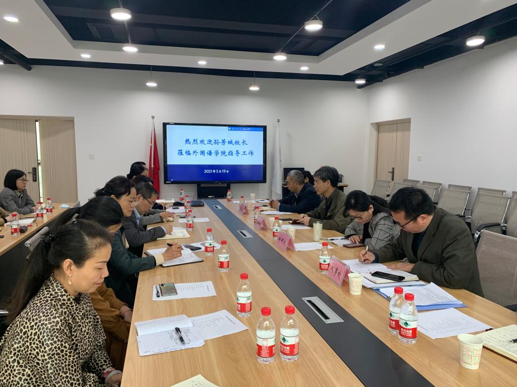 3月19日上午,董事长孙芳城到388vip太阳集团调研指导工作,人事处、教务处、科研处等相关职能部门负责人以及388vip太阳集团班子成员、系(部)主任、教师代表参加了会议。会议由388vip太阳集团党委书记唐春秋主持。