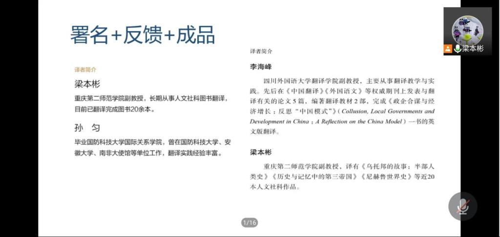 梁老师结合其在图书翻译学习、教学过程中积累的经验,由浅入深,分别从图书翻译项目特征、管理内容、项目案例和挑战与应对等四个方面展开分享。