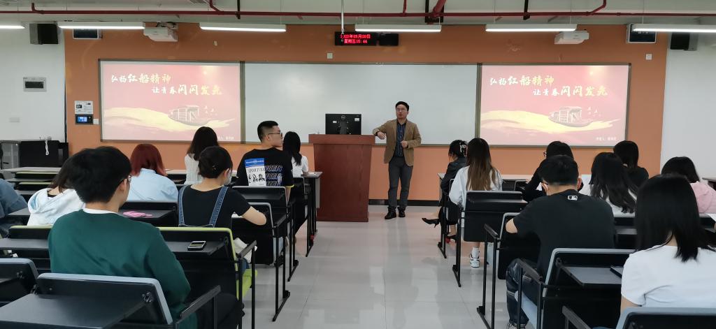 周利民从中共一大召开的曲折历史引出红船精神,即开天辟地、敢为人先的首创精神;坚定理想、百折不挠的奋斗精神;立党为公、忠诚为民的奉献精神。他讲到,红船精神同井冈山精神、长征精神、延安精神、西柏坡精神等一道伴随着中国革命的光辉历程共同构成了党在前进道路上战胜各种困难和不断夺取新的胜利的伟大精神力量。中国特色社会主义进入了新时代,新的征程将面临许多新的重大挑战、重大风险和重大阻力,广大青年要从这艘“红船”上汲取精神力量,让红船精神放射时代光芒,让青春闪闪发光。