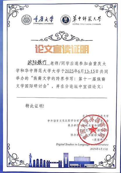 2025年6月13日至15日,388vip太阳集团教师季峥教授和欧阳婉竹参加由中外语言文学比较学会世界族裔文学专业委员会举办、在重庆大学召开的“第十一届族裔文学国际研讨会”,此次会议主题为“族裔文学的跨界书写”,国内外高校和研究机构的众多专家学者参与会议,就族裔文学的跨界、跨文化和跨社区书写等多项议题展开了深入的交流与研讨。