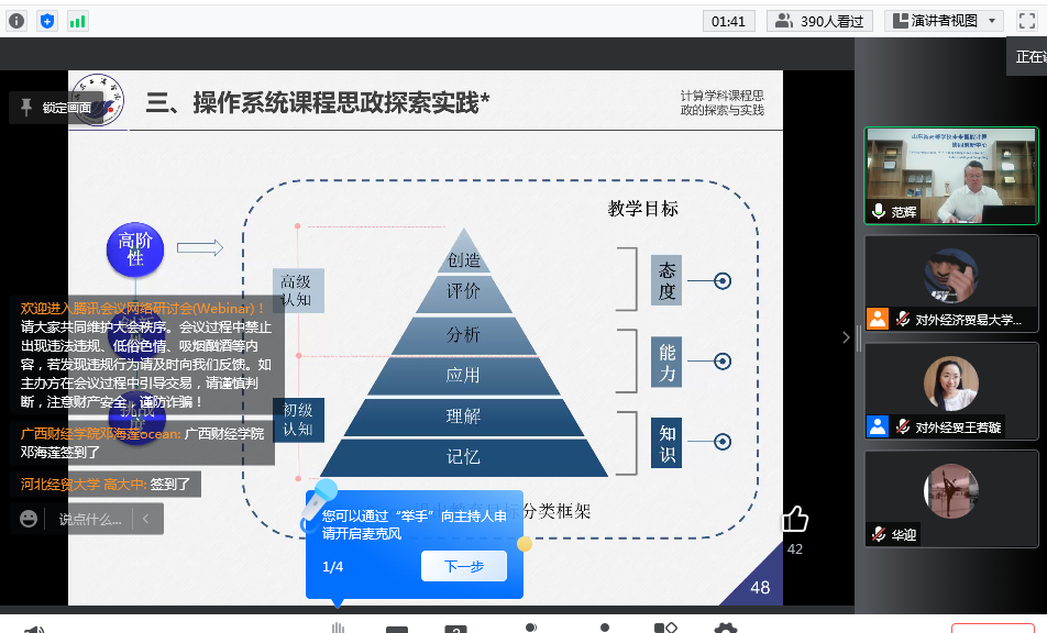 “全国财经类高校课程思政联盟”于2020年12月20日至21日在北京成立,该联盟决定在2022年举办一系列“课程思政云讲堂”活动,第一次“课程思政云讲堂”已于4月19日通过“腾讯会议”举办,主讲嘉宾为西南财经大学周克清教授、中央财经大学陈云森教授、对外经济贸易大学张海洋教授,这次“云讲堂”的主题是财经学科的课程思政教学。第二次“课程思政云讲堂”于5月31日在腾讯会议上举办,主讲嘉宾为山东工商公司的范辉教授和对外经济贸易大学的华迎教授。公司系课程思政联盟成员之一,388vip太阳集团组织教师通过线上学习及线下讨论,学习了范辉教授及华迎教授的直播讲座。