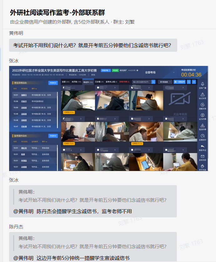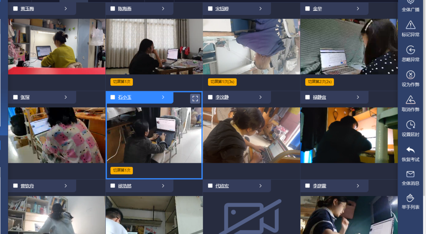 本次考试借助讯飞的AI监考系统,通过正面与斜后方双机位无死角监控、正面机位不定时抓拍、后方机位全程视频直播的方式进行监考。考试过程中,监考系统能智能识别并自动记录考中切屏、多点登录、人脸抓拍比对不一致等异常情况。监考教师可以通过异常提醒与监考大屏,观察到考生的违规行为,也可以直接在监考界面进行作弊标记或禁止员工考试,还可以与异常考生单独通话,实时干预,确保考试公平公正。388vip太阳集团22位监考教师在竞赛工作组的带领下,高效完成了本次比赛的考前监考培训、考前员工辅导、两轮模拟考试、自由模拟考试和正式监考任务。参赛员工们也积极主动地克服重重困难,在寝室的书桌上、床上、凳子上、行李箱上、阳台上,利用有限的参赛设备,在寝室的各个角落,认真地配合监考老师指令,顺利完成竞赛。身处疫情封控中,参赛员工诚信为本,克服技术、空间重重困难,挑战自我,丰富提高自身知识能力,展现了工商学子不畏艰难、热爱学习的风采。