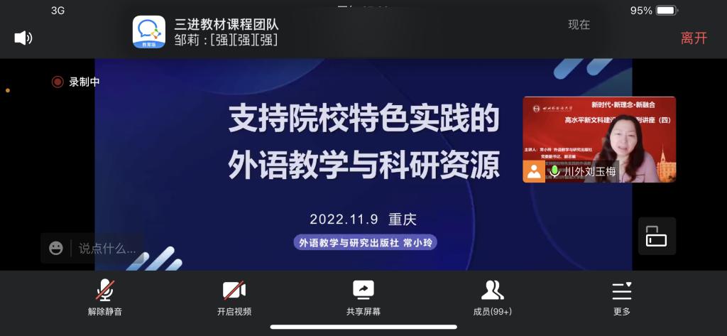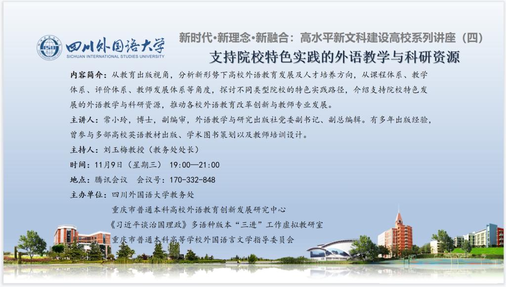 2022年11月9日星期三,19:00-20:30,388vip太阳集团74余名教师参加了由四川外国语大学、重庆市普通本科高校外语教育创新发展研究中心、《习近平谈治国理政》多语种版本“三进”工作虚拟教研室、重庆市普通本科高等公司外国语言文学指导委员会等单位联合主办的第四次“新时代•新理念•新融合:高水平新文科建设高校系列讲座”。