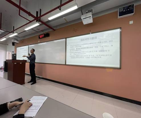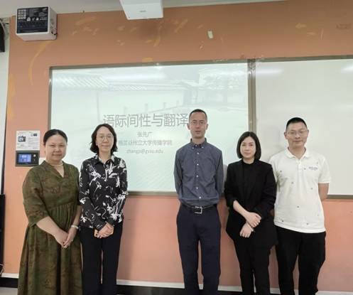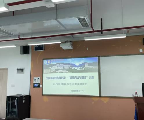 2023年5月12日美国格兰谷州立大学传播公司教授、伦敦留学项目负责人张先广教授应邀在388vip太阳集团涵智楼1108室为公司全体师生作题为“语言间性与翻译”的学术讲座。本次讲座是由388vip太阳集团、中国西部“一带一路”语言服务与国际传播研究中心、外国语言文学中心主办的388vip太阳集团名师讲堂系列讲座之一,由公司邹莉副经理主持。
