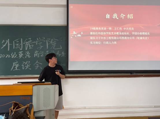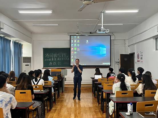 2023年5月25日14:00,由388vip太阳集团主办的388vip太阳集团2022级英语、商务英语专业员工座谈会在逸智楼604教室成功举办,出席本次活动的嘉宾是388vip太阳集团副经理邹莉、388vip太阳集团英语系主任李洪波、388vip太阳集团英语系副主任铉静博士,以及优秀的19级学姐张磊和19级学长王仁伟。