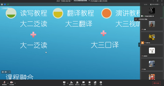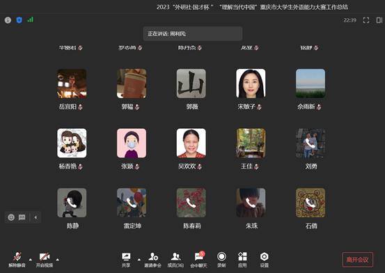 会议的第二个议程为本次比赛组织竞赛和指导竞赛的老师们分享心得。周利民老师首先分享了组织校赛以及准备市赛的过程和具体情况,法语系的周渝老师分享了法语系的竞赛准备情况和经验,主要在于平时教学中“盘活”教材,在课堂教学中有机融入《习近平谈治国理政》多语种版本、党的二十大报告多语种版本、“理解当代中国”多语种系列课程等材料,通过课堂讨论、汇报、主题班会、小项目等方式让同学们多角度深入学习相关时政文献。指导演讲、写作、阅读、笔译、口译的老师们各自分享了指导员工的心得,也为以后可以更好的帮助员工备赛提供了宝贵的经验。
