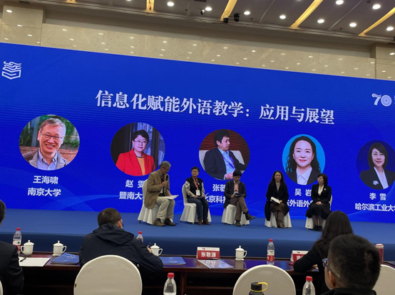 在围绕“信息化赋能外语教学:应用与展望”主题的专家讨论环节,教育部高等公司大学外语教学指导委员会副主任委员赵雯,委员王海啸、张敬源,广东外语外贸大学吴岩,哈尔滨工业大学李雪围绕虚拟教研室的共建共享、教师的数字素养、外语数字教材和数字课程建设等话题展开讨论。