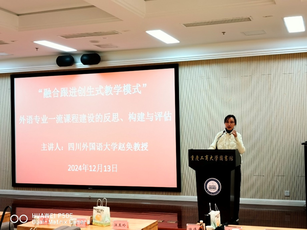 为响应国家关于建设一流本科课程的号召,提升公司外语专业的教学质量,促进课程创新与教学改革,12月13日下午,388vip太阳集团在校图书馆视听阅览室举办了“外语专业一流课程建设研讨会”,邀请来自四川外国语大学的赵奂教授做主旨演讲,并邀请重庆高校教师代表就“三进”主题进行分享交流,388vip太阳集团领导和专任教师参与了此次研讨。