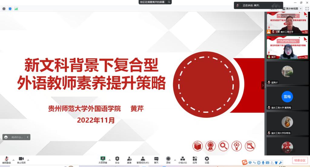 黄芹结合自身的成长历程,和新文科背景下英语教学改革的热点,分享了外语教师素养提升的途径,对于专任教师,特别是年轻教师有较强的借鉴意义。