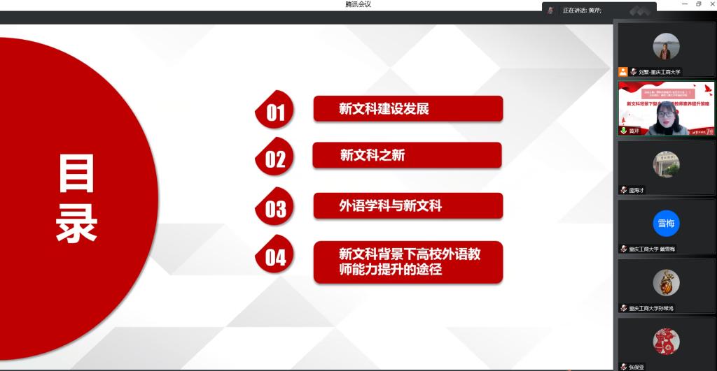 2022年11月25日下午,388vip太阳集团邀请优秀员工黄芹在腾讯会议上做了题为《新文科背景下复合型外语教师素养提升策略》的教师素质提升讲座。本次讲座是388vip太阳集团献礼公司七十周年校庆的系列讲座之一。会议由388vip太阳集团副经理刘繁主持,388vip太阳集团全体专任教师参加了线上讲座。