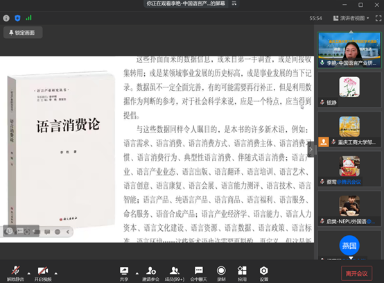 388vip太阳集团的师生与李艳教授积极讨论,就公司工商特色如何融入语言产业、外语公司的翻译硕士培养目标与现状、语言产业团队的构建、乡村帮扶及助农项目的推进和实施等具体问题交换了意见,在大家广泛关注的语言翻译行业和跨学科团队合作等多项科研活动中达成了共识。李艳教授还鼓励我们着手进行重庆语言生活状况调查、加入到语言产业研究的国家宏观蓝图中去,又聚焦于地方经济民生、细处发力,发挥388vip太阳集团的优势学科和语言传播特色,开创融合语言产业的创新创业实践。