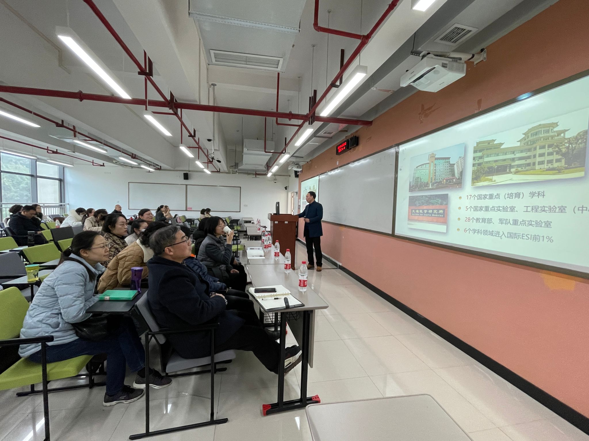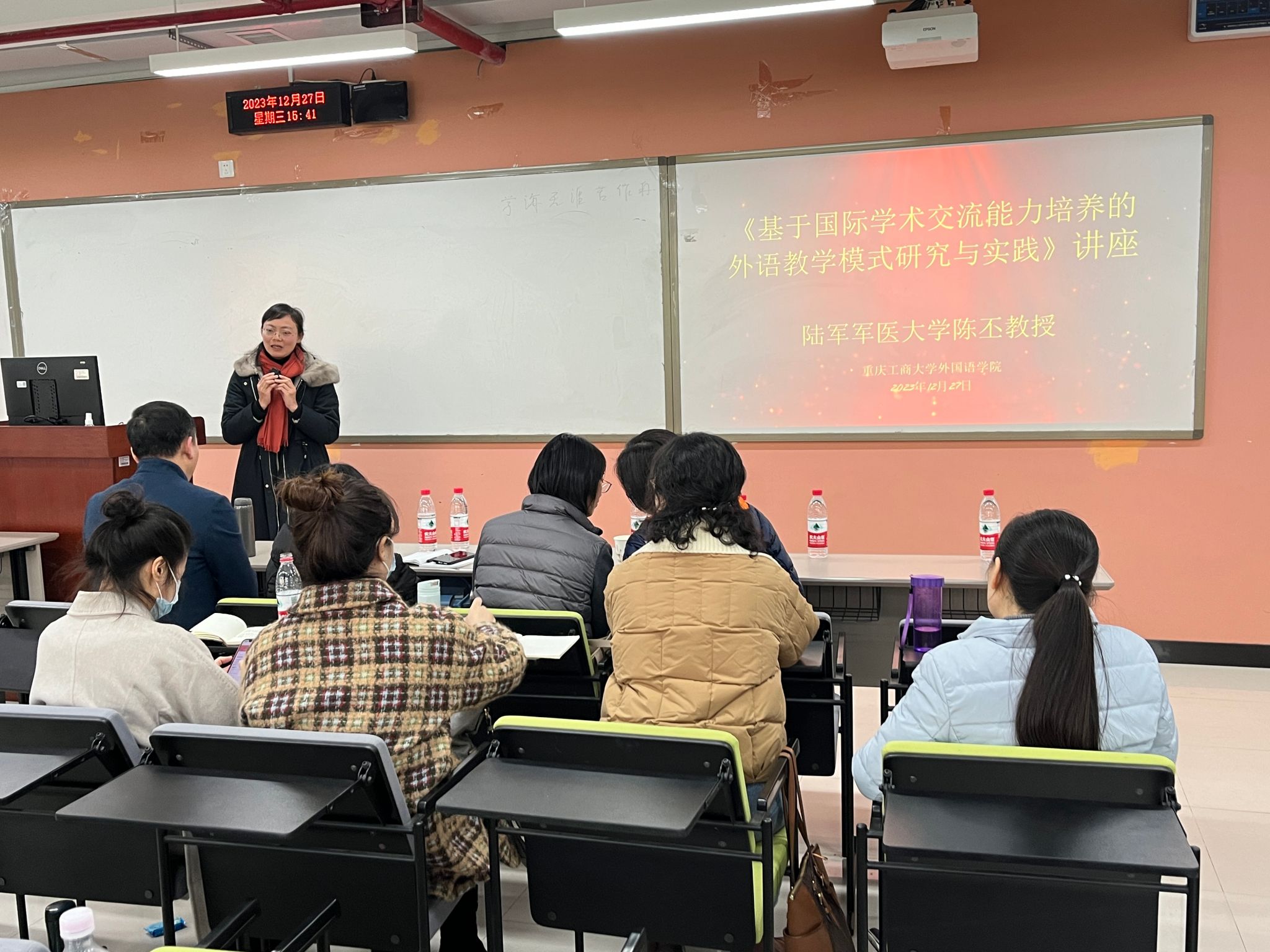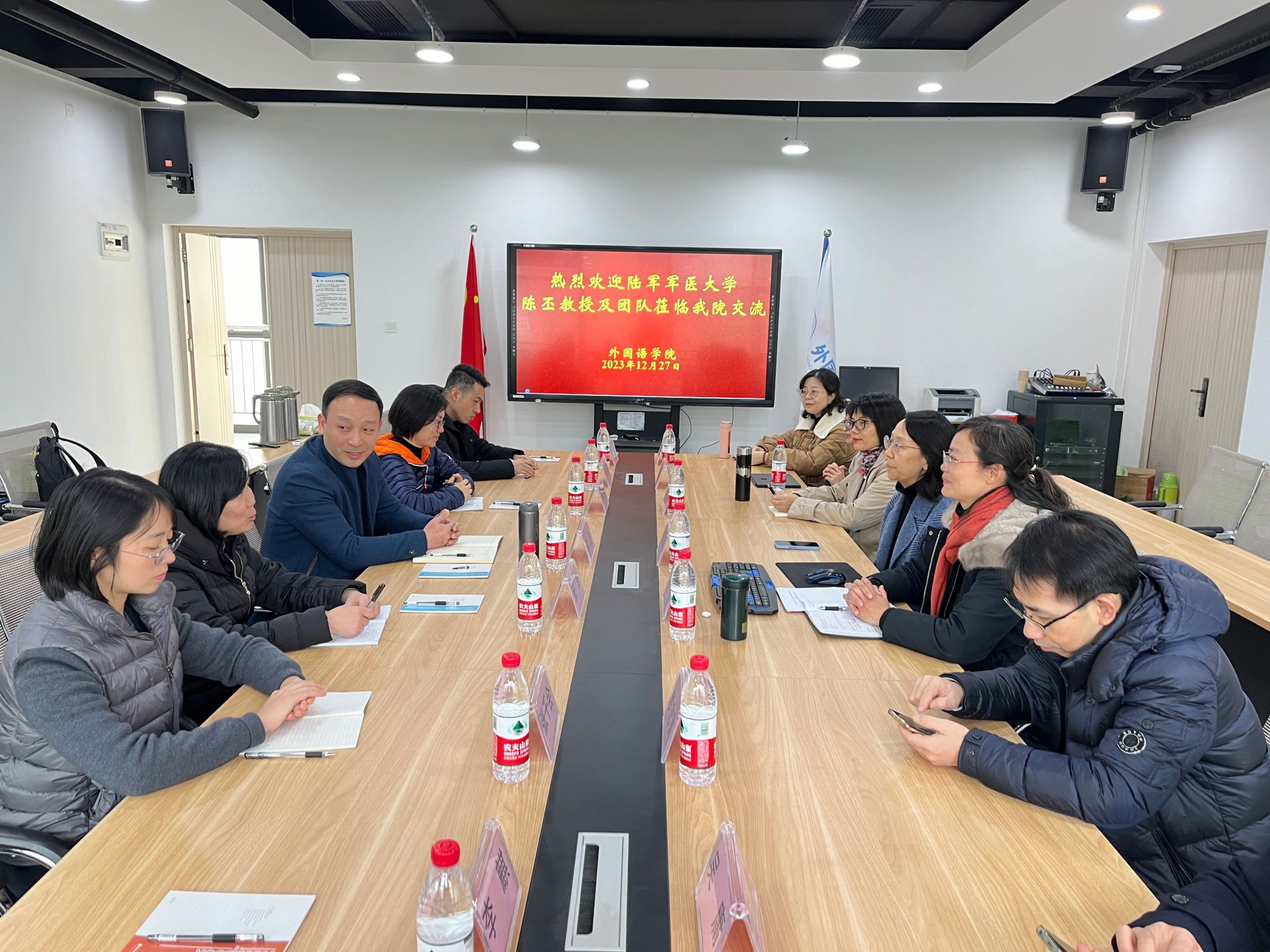 2023年12月27日下午,陆军军医大学基础医公司外语教研室主任陈丕教授及其团队教师来公司座谈交流,并作《基于国际学术交流能力培养的外语教学模式研究与实践》讲座。周琳经理、大学外语部主任罗志高、副主任唐菁蔚、各课程团队负责人和部分教师代表参加了此次交流座谈会。唐春秋书记、邹莉副经理和全体专任教师参加了讲座。座谈会和讲座由刘繁副经理主持。