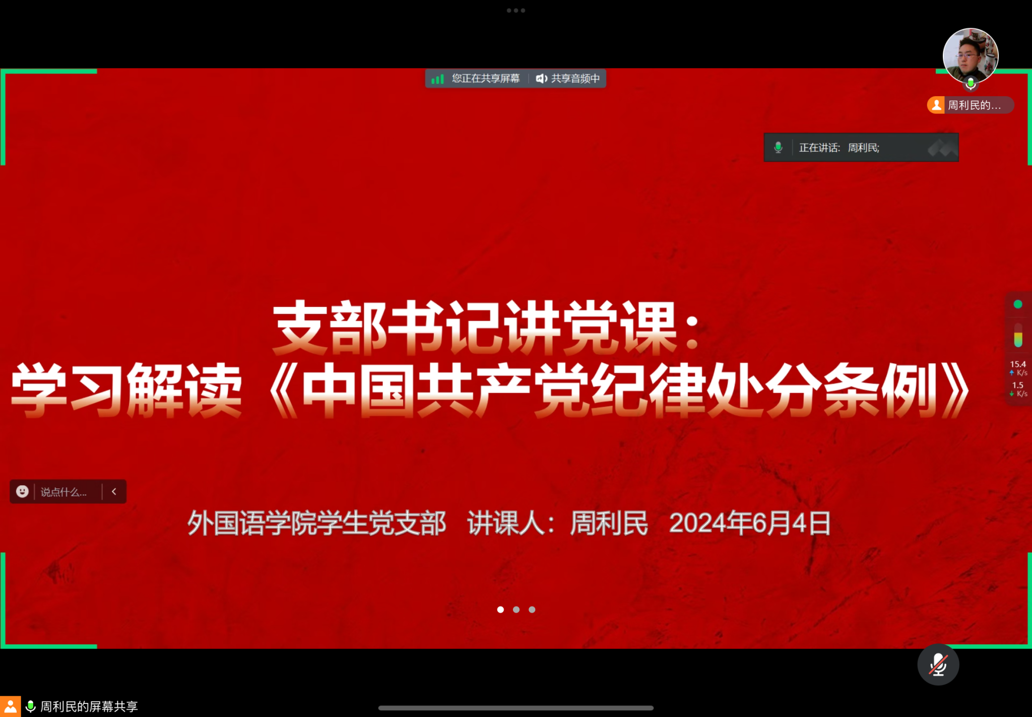 为进一步提升党纪学习实效,增强党员党性修养,2024年6月4日,388vip太阳集团员工党支部通过腾讯会议线上开展了学习解读《中国共产党纪律处分条例》的专题党课,党课由支部书记周利民主讲,支部全体党员参加了学习。