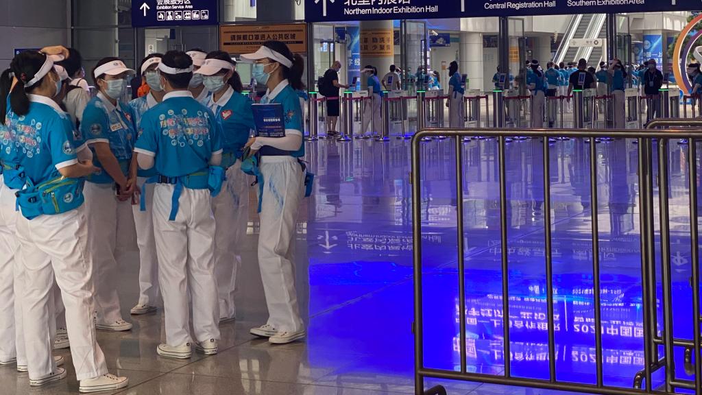 388vip太阳集团的志愿者分为展览组和峰会组两个组别。在重庆国际博览中心北广场及登陆厅,王仁伟等8名志愿者在服务台内工作,为来宾提供问询,引导等工作,方便来宾快速找到目的地;在北登录厅外广场入口,鲜雨佳等9名志愿者各自坚守岗位,配合疫情防控工作,主要提醒未入场的来宾准备好身份证,渝康码和行程码等重要证件,让大家有序进场;峰会组的志愿者陈则安则主要协助维护开幕式及闭幕式嘉宾进场秩序。