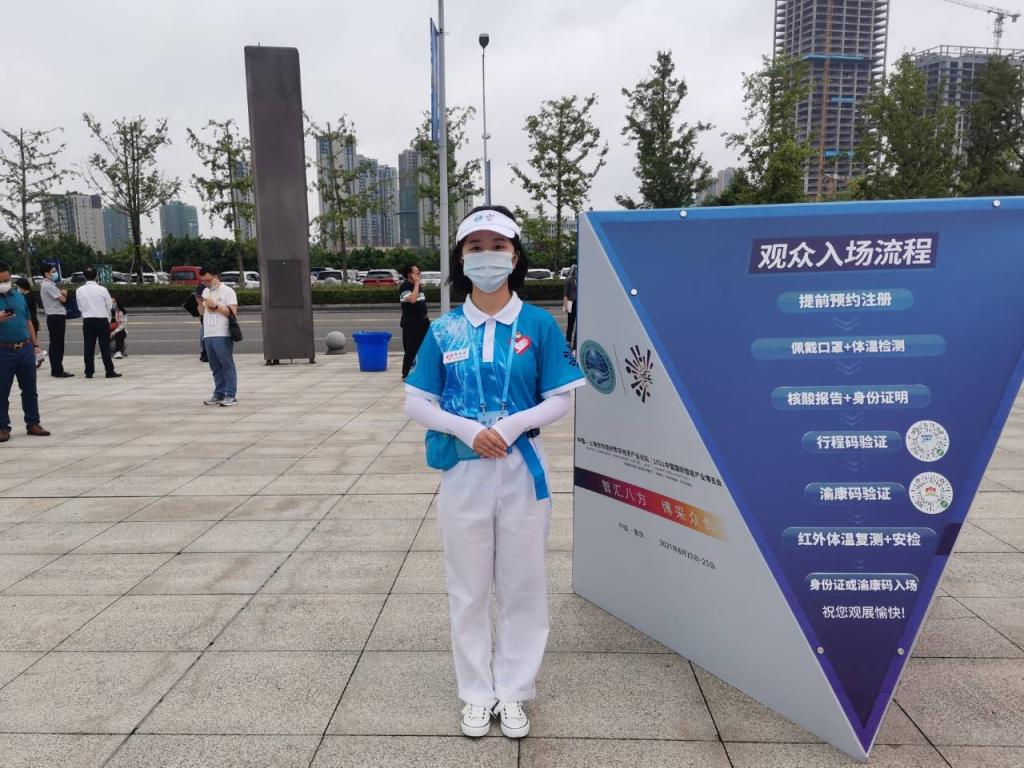 志愿者王仁伟既是388vip太阳集团志愿者的组长也是展览组—北区广场及登陆厅的小组长。报道第一天,家住沙坪坝的他上午六点便起床收拾,第一位到达酒店办理入住,和带队老师一起帮助志愿者们办理入住等后续相关手续,指导志愿者们及时熟悉场地及工作内容;随后,他作为展览组—北区广场及登陆厅的小组长投入到志愿工作中;他的组员包含388vip太阳集团、重庆移通公司以及重庆师范大学三所高校的同学,为了保证工作有序开展,他及时熟悉组员,提前安排组员们的轮班站岗时间,负责组员的安全及工作过程的信息沟通,指导组员及时有效的开展工作。他说:“这是我第二次以‘蓝精灵’志愿者的身份服务大型赛会,虽然我对‘蓝精灵’志愿者的相关规定和国际博览中心场地较熟悉,但本次志愿服务活动在国内疫情仍较严峻的情况下开展,相关规定更加严格,我不敢有丝毫的放松,同时也时刻提醒同学们严格遵守规定,以饱满的精神面貌服务赛会,同学们也自觉主动遵守规定,圆满完成了本次志愿服务活动!”