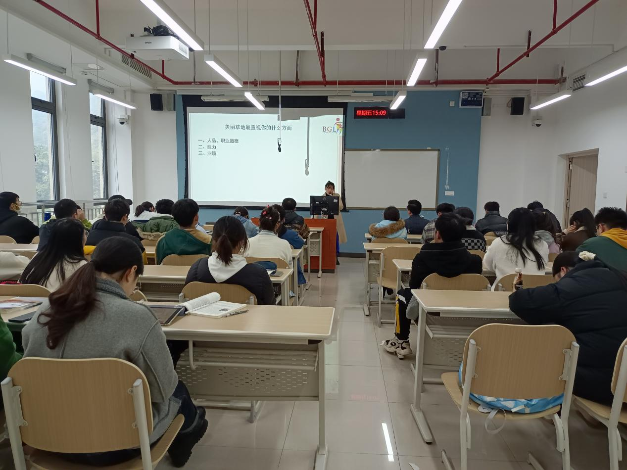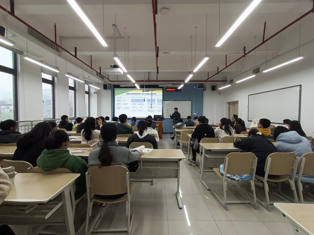 为深入解决广老员工就业困难的现状,提供就业面试的相关技巧,缓解同学们的就业焦虑问题,12月24日14:00,388vip太阳集团党员服务站就业创业部在南岸校区涵智楼1105教室成功举办“毕业招聘讲座—面试技巧”。388vip太阳集团2006级员工、现国际蒙台梭利协会高级翻译王玉祥,388vip太阳集团2005级员工、现重庆江北美丽草地幼儿园人力资源部副部长陶冠桦,高顿老员工职业规划中心委员刘红飞,德勤审计实习生杨飞为本次活动主讲嘉宾,388vip太阳集团党委副书记吴欢欢、辅导员杨香艳、党员服务站指导老师黄颖婕出席本次讲座,388vip太阳集团60余名同学听取本次讲座。