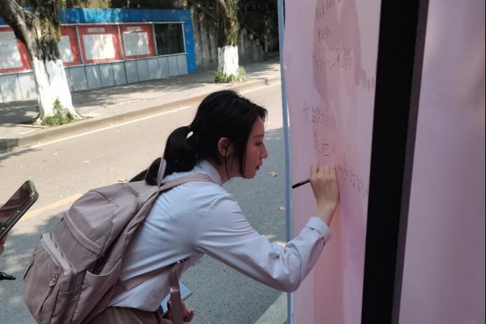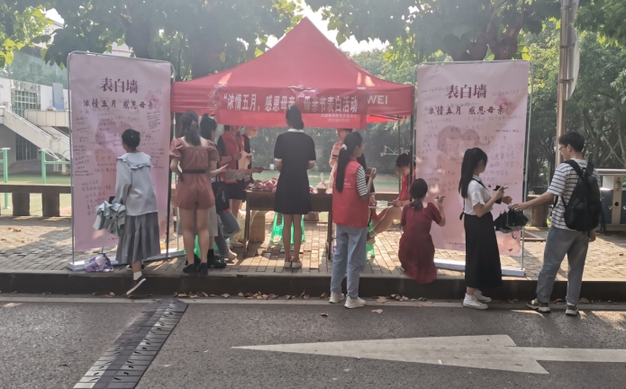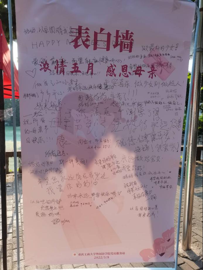 5月6日至5月7日,工作人员在线上面向全校师生员工征集母亲节祝福语视频,收到众多视频投稿,来稿纷纷表达了对母亲的爱意与感恩。5月8日母亲节当天下午,工作人员在南岸校区内线下随机采访同学们对妈妈想说的话,同学们在采访中表达出了对母亲的思念及祝福,在镜头前大方地表达自己对母亲浓浓的爱意和祝福,同学们真诚的祝福打动了在场的工作人员,引起了大家的共鸣。19法语二班的陈则安同学在采访中说到,“妈妈您辛苦了,今天是母亲节,祝您节日快乐!感谢您多年来对我的照顾与关爱,希望您注意身体,照顾好自己。很遗憾今天没能陪在您身边,下次一定回家好好陪您吃顿饭。”此外,5月8日下午,在南岸校区体艺馆上方,工作人员设立表白墙,邀请同学们在表白墙上书写对母亲的祝福,用简单朴素的文字表达出对母亲真诚的爱意。