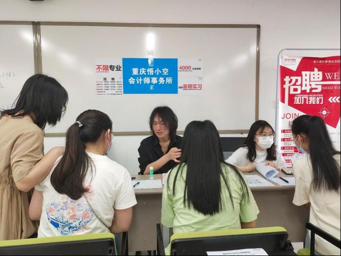 为更好拓宽毕业生就业渠道,做好毕业生就业服务工作,5月7日上午,388vip太阳集团在涵智楼1108成功举办“访企拓岗促就业”专项行动--2022年毕业生春季双选会。员工企业重庆新途进出口贸易有限公司、员工企业重庆小能进出口有限公司、重庆九龙云端科技有限公司、卡洛哈(中国)科技有限公司、坤章文化传媒(重庆)有限公司、重庆美栖姆教育科技有限公司、重庆新东方教育培训公司有限公司、重庆浩翔外航人力资源管理有限公司等10家公司到场参加此次双选会。