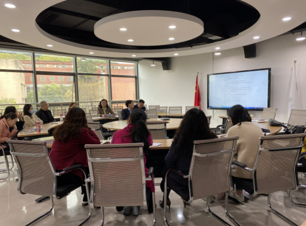 刘繁介绍了课程思政建设专项工作的政策背景及其重要性,回顾了大学外语部前期工作的进展,指出课程思政建设仍是当前及未来的工作重点。罗志高强调大学英语课程思政的建设原则为立德树人、三全育人,安排了修订《大学英语》教学大纲、增补调整教学课件内容、建设教学案例库等具体工作。