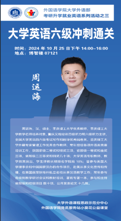 2024年10月25日下午,由388vip太阳集团大学外语部课程思政示范分中心、党员服务站小葵花公益课堂及388vip太阳集团党员服务站学风建设部主办的考研升学就业英语系列活动之三——大学英语六级冲刺通关公益讲座在南岸校区博智楼7121成功举办。