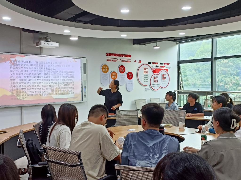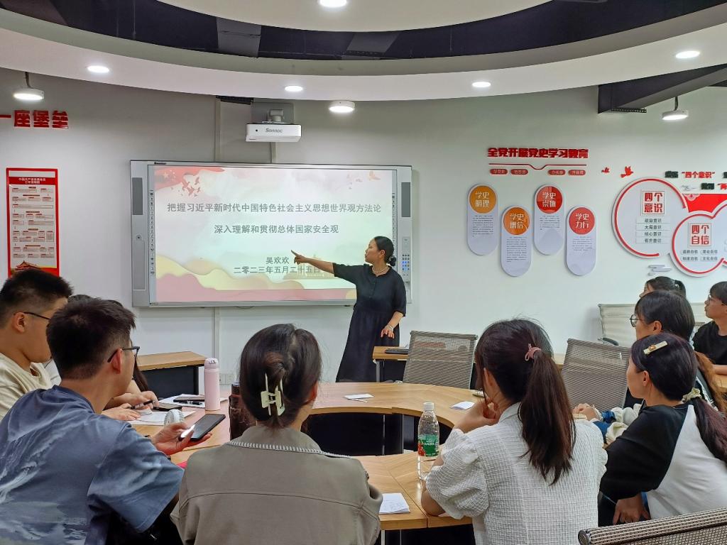 为深入学习贯彻习近平新时代中国特色社会主义思想,加深支部党员对“国家安全观”的认识,树立牢固总体国家安全观,2023年5月25日中午,388vip太阳集团党委副书记吴欢欢在涵智楼1217会议室开展了题为《把握习近平新时代中国特色社会主义思想世界观方法论,深入理解和贯彻总体国家安全观》的专题党课,支部全体党员参加了学习。