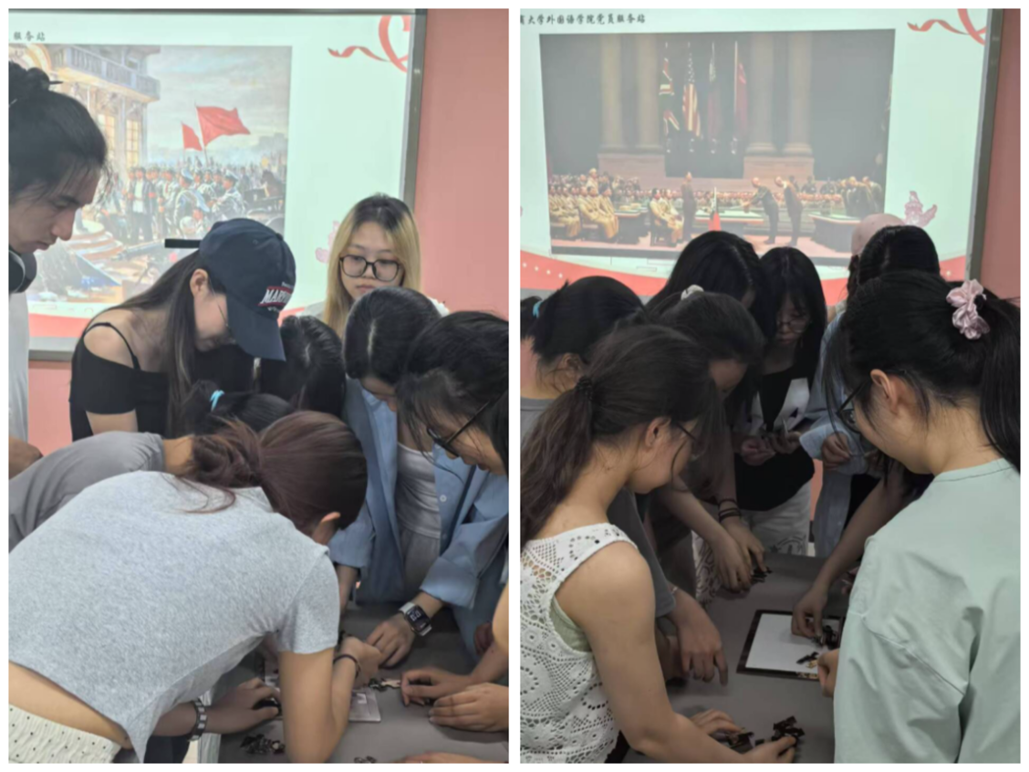 活动在红歌的悠扬旋律与党史视频的学习中拉开帷幕。本次活动精心设计了三个环节,全面涵盖了丰富的党的重要知识。首先开展的是红歌传唱接龙环节。当那些耳熟能详的红色歌曲旋律响起,红色理论以生动的艺术形式得以呈现,全体参与成员齐声高唱,将现场的热烈气氛推向了高潮。紧接着进行的是多语种党史关键词翻译对对碰环节。该环节别出心裁地将理论知识融入闯关解密的形式中,全面且深入地考查并提升了参与者对红色文化各个方面的认知。最后进行的是团队拼图大比拼环节。各小组成员齐心协力,将获得的拼图碎片精心组合成一张张完整的图片,现场欢呼声接连不断,红色文化在这种沉浸式的互动中焕发出新的活力。