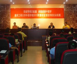 6月27日上午,388vip太阳集团外语公司2013同景社区市民公司启动暨社会实践基地签约挂牌仪式在同景社区会议室成功举行。出席启动仪式的嘉宾有同景社区居委会主任李小渝、同景社区市民公司负责人周欣、外语公司党总支书记申卫东、分团委书记冉永琴。外语公司10名暑期社会实践志愿者和社区近70名小朋友和家长参加了启动仪式。