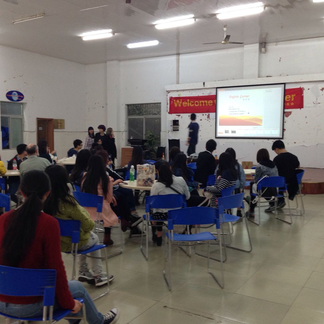 本次英语角的主题是“Discussion on symptoms of being a smartphone addict”,即探讨关于现今社会人们沉溺于智能手机的现状。活动开始,主持人登场,他幽默的开场白带领大家进入情境,而后简单介绍了活动内容。第一个环节是欣赏一段与主题相关的视频小电影,到场的同学与外教们都认真进行了观看。影片播放完毕,主持人开始邀请外教和员工们发表各自的意见看法,大家都踊跃发言并提出自己的观点,现场气氛热烈活跃。之后主持人又提出了一系列关于智能手机的问题,同学们都积极讨论作答。讨论过后是充满乐趣的游戏环节。在主持人的带动下,同学们都跃跃欲试。本次游戏名称为表情大比拼,主要内容是上场的同学根据PPT提示的有关表情的单词做出相应的表情,表演生动者即获得奖品。一位男同学夸张有趣的表演带领全场气氛走向又一个高点,现场掌声笑声不断。最后就是活动的最后一个环节:Free talk,大家纷纷拉好座椅围着小圆桌坐好,并与自己的partner开始交流,活动中心充满热烈的讨论声和持续的笑语声。