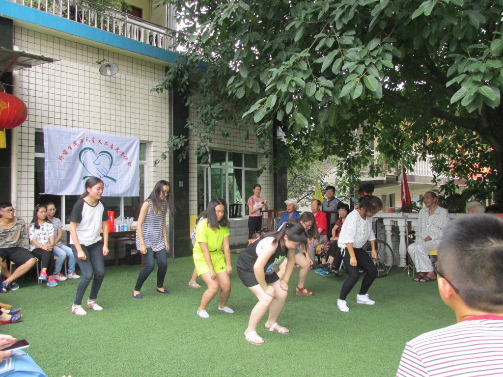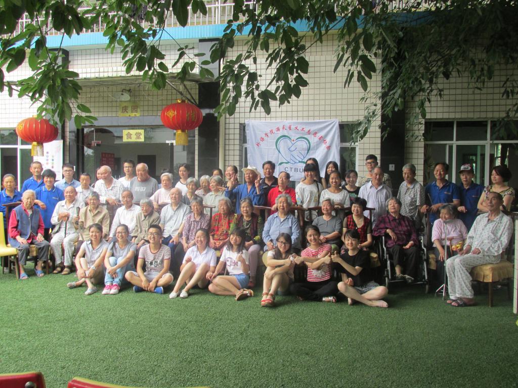 下午两点钟,庭院中已聚集了许多老人等待着志愿者的到来。不久活动开始了,多才多艺的志愿者献上了家乡的名曲《刘海砍樵》,老人们也不甘示弱,一首《天仙配》和志愿者一较高下,现场的气氛在志愿者和老人的歌曲互动下愈发高涨。随后擅长书法的同学写下“福寿”二字并赠给老人,敬老院更是卧虎藏龙,四位老人上台展示书法,令志愿者佩服连连。而另一位老人的近景魔术,也让大家连连叫好。现场气氛热烈,欢声笑语飘荡在福源的每一个角落。活动结束后,全体老人和志愿者们合影留念。