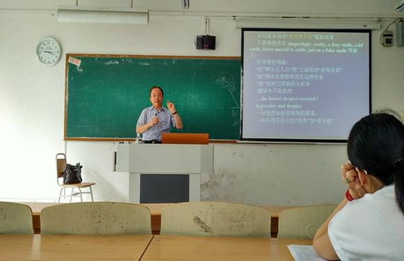 林巍教授主要以首届中国当代优秀作品国际翻译大赛部分译文及相关素材为例进行讲解,形象生动,融贯中外,给同学们留下了深刻印象。林巍教授指出,东汉至唐宋时期、明末清初时期、鸦片战争至五四运动时期、以及本世纪至今,这四个翻译的高潮;并点明,当今中译外已经成为了大趋势。随后,林巍教授主要通过苏童的《人民的鱼》、乔叶的《月牙泉》、贾平凹的《倒流河》等作品,向同学们详细地介绍在做中译外文学翻译时,应当注意的“忠实”、“文化底蕴的翻译”、“得意忘言”等要点。在场的每一位同学都被林巍教授的博学多识,精益求精的气质所感染。