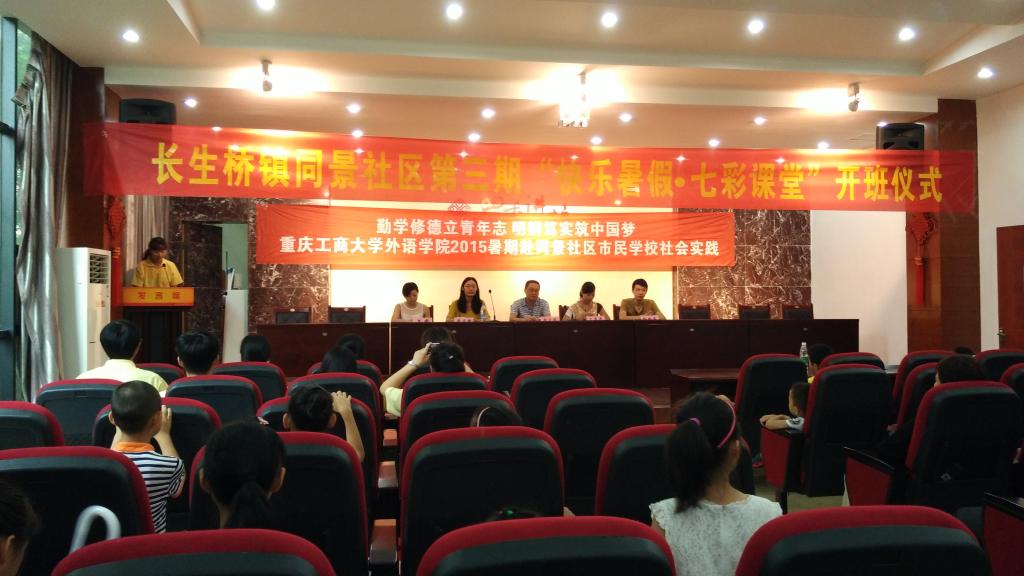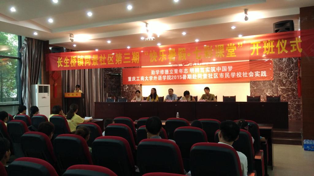 2015年7月3日,迎着淅淅沥沥的小雨,388vip太阳集团外语公司2015暑期社会实践启动仪式在茶园同景社区市民公司举行。长生桥镇团委副书记杨明睿、同景社区党委书记文李燕、同景社区团委书记王睿以及388vip太阳集团外语公司党总支书记申卫东、外语公司分团委副书记黄志婕出席了本次仪式。