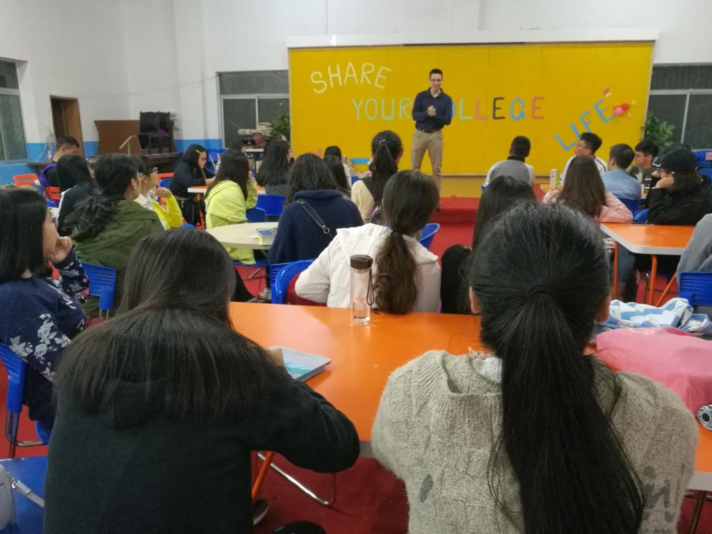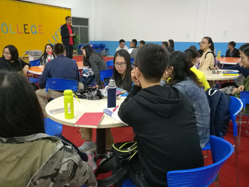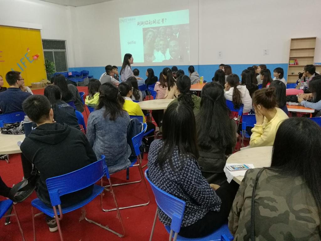 淅沥的小雨并未浇熄同学们对英语的学习热情,活动未始,外语活动中心已是人声鼎沸。本期英语角的主讲老师Nancy在活动中与同学们热情互动,不仅给大家详细介绍了雅思考试的组成部分和需要注意的具体事项,还鼓励大家克服畏惧感,积极备战雅思考试。Nancy老师谈及到英语学习中的难题——如何有效的背单词时,同学们积极分享了自己巧记单词的有效方法,Thomas老师更是用“活记软背”这诙谐幽默的四字要诀简明扼要地传授了自己的方法和技巧。再说到猜新词的互动环节,同学们通过观察生动形象的图片,脑洞大开,踊跃回答,囊获了一件件心仪的奖品。本期英语角活动中,除了让同学们相互分享学习方法外,风趣幽默的Thomas、Sam老师还一一讲述了自己在中国遇到的趣事,让同学们爆笑连连。