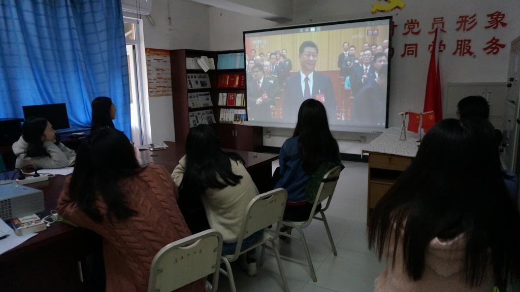 随着国歌声响起,全体起立,奏唱国歌,所有人的眼光都聚集到了大屏幕上,大家认真观看习总书记在开幕会上代表十八届中央委员会作的题为《不忘初心,牢记使命,高举中国特色社会主义伟大旗帜,决胜全面建成小康社会,夺取新时代中国特色社会主义伟大胜利,为实现中华民族伟大复兴的中国梦不懈奋斗》的报告,认真记录下与自己生活、学习息息相关的新举措、新变化。既庄严又肃穆的会场和习总书记掷地有声的发言让每一个同学肃然起敬,被这庄严的气氛所感染。