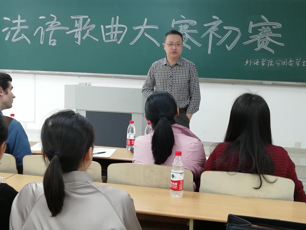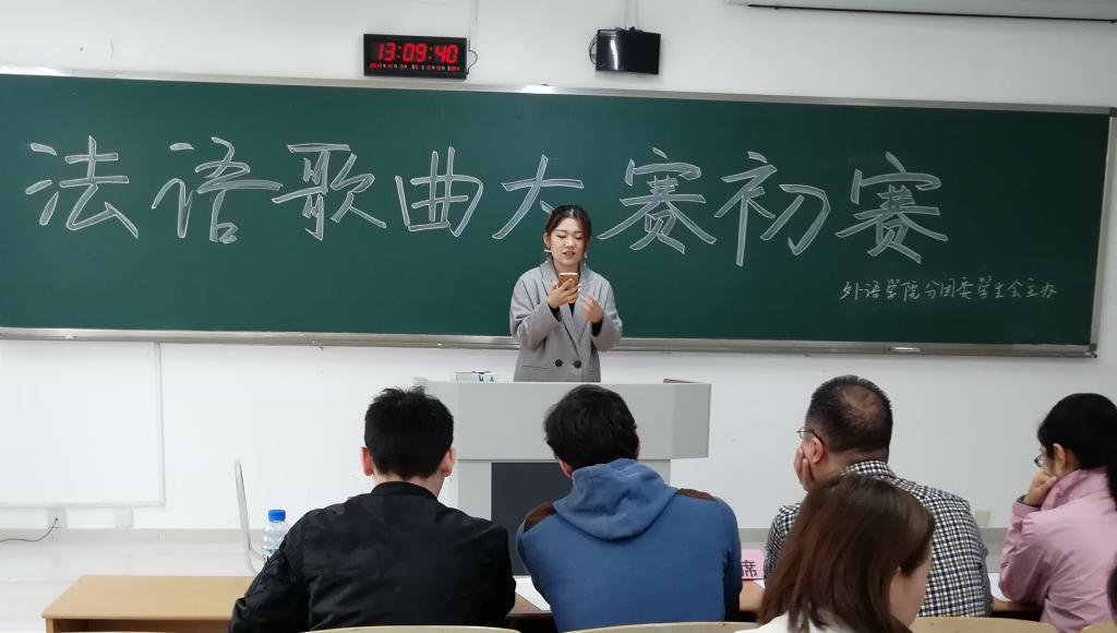 2017年11月3日中午1点整,由388vip太阳集团外语公司分团委员工会权益部主办的法语歌曲大赛初赛在南岸校区博智楼07210教室成功举办。本次比赛很荣幸的邀请到了外语公司法语系主任曹鹏老师、分团委书记黄志婕老师、钱园园老师、外籍教师Jonathan和张淋学长作为评委,来自外语公司、国际商公司各法语班的同学们参加了本次比赛。