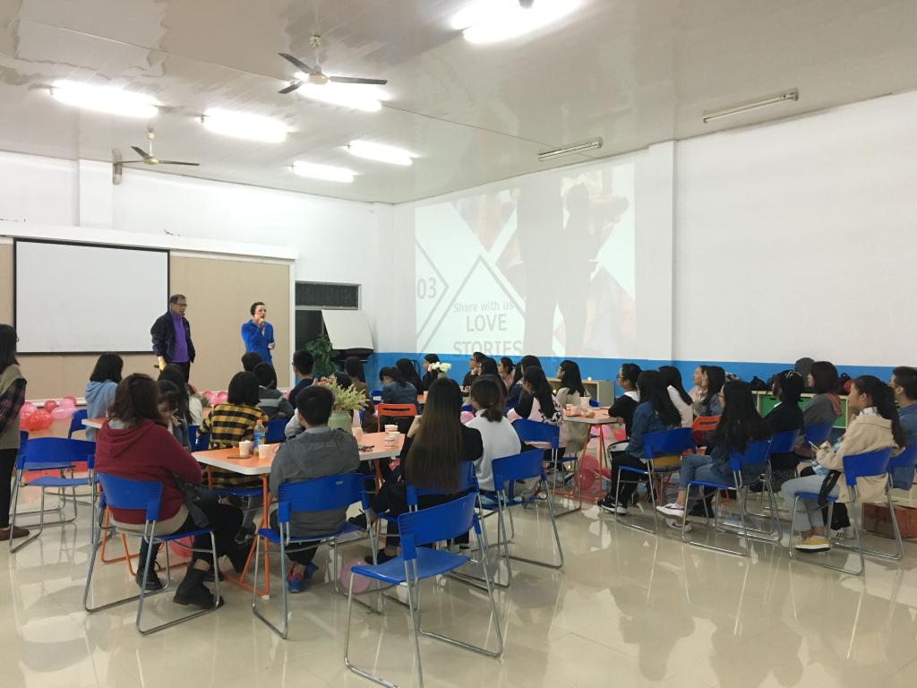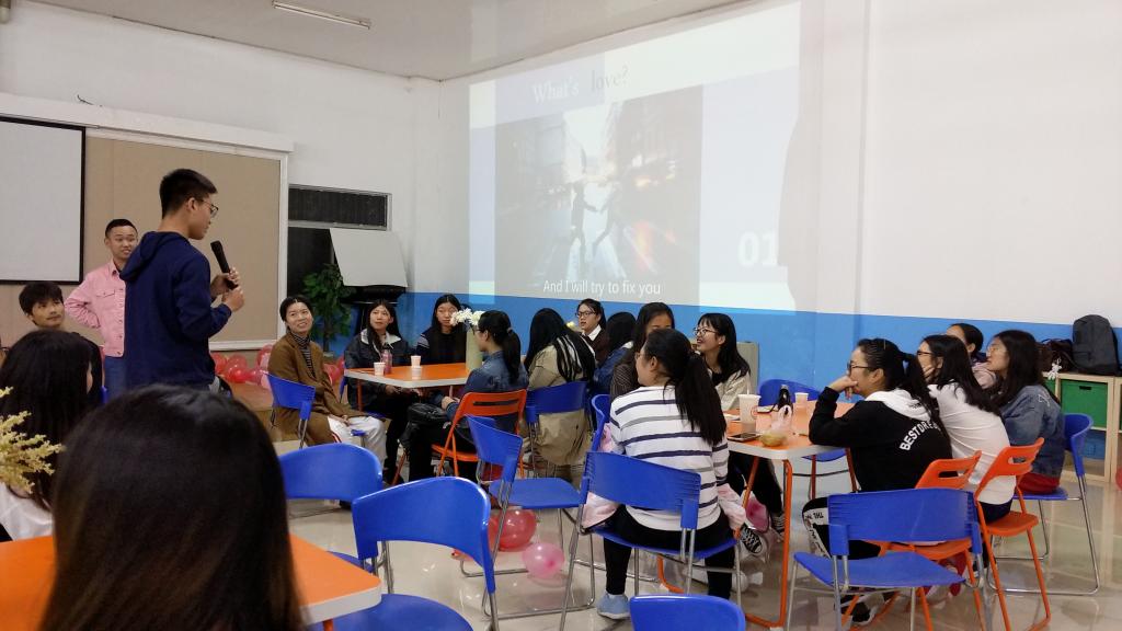 此次活动由陈希和陆玉佩同学主持,主题为romance。一曲浪漫之歌和一段温情视频剪辑拉开了本期英语角的帷幕,英语爱好者们共享良辰,听一支曲,悟半生情。在这之后外教Brittany以情动人,将她与Jack的唯美爱情娓娓道来,点燃了参与者的热情,随后参与人员分别以Brittany和Sam为中心分成两组开始分享独属于自己的那份关于爱的故事,在不觉中偶然触动内心的柔软部分,泪便潸然落下。此外,外教们表达了自己对爱独到的见解,让在座的同学们对爱情有了不一样的理解和感知。